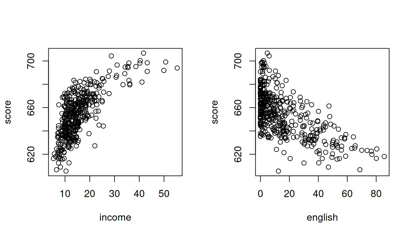 CASchools$score = (CASchools$read+CASchools$math)/2 The variable english indicates the proportion of students whose first language is not English and who may need additional support. We might be interested in the dummy variable HiEL, which indicates whether the proportion of English learners is above 10 percent or not: