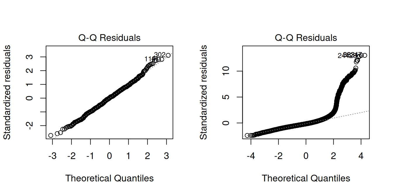 In the left plot you see the Q-Q-plot for an example with normally distributed errors. The right plot indicates that, in our regression of wage on education and female, the normality assumption is implausible.