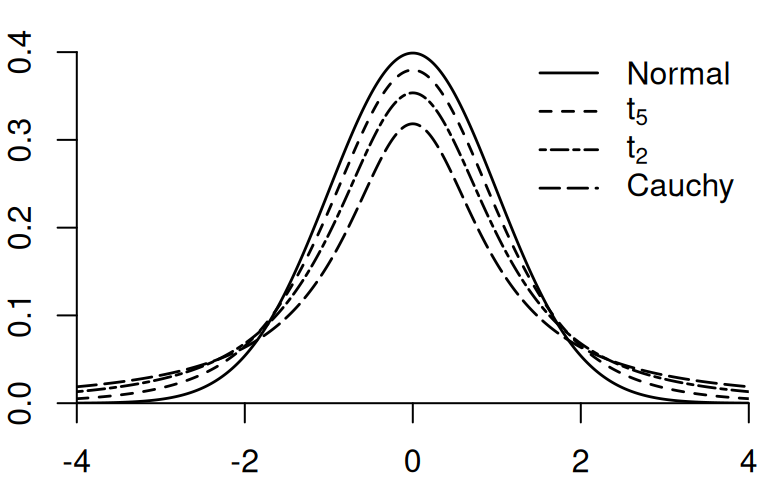 The t-distribution with m=1 is also called Cauchy distribution. The t-distributions with 1, 2, 3, and 4 degrees of freedom are heavy-tailed distributions. If m \to \infty then t_m \to \mathcal N(0,1)