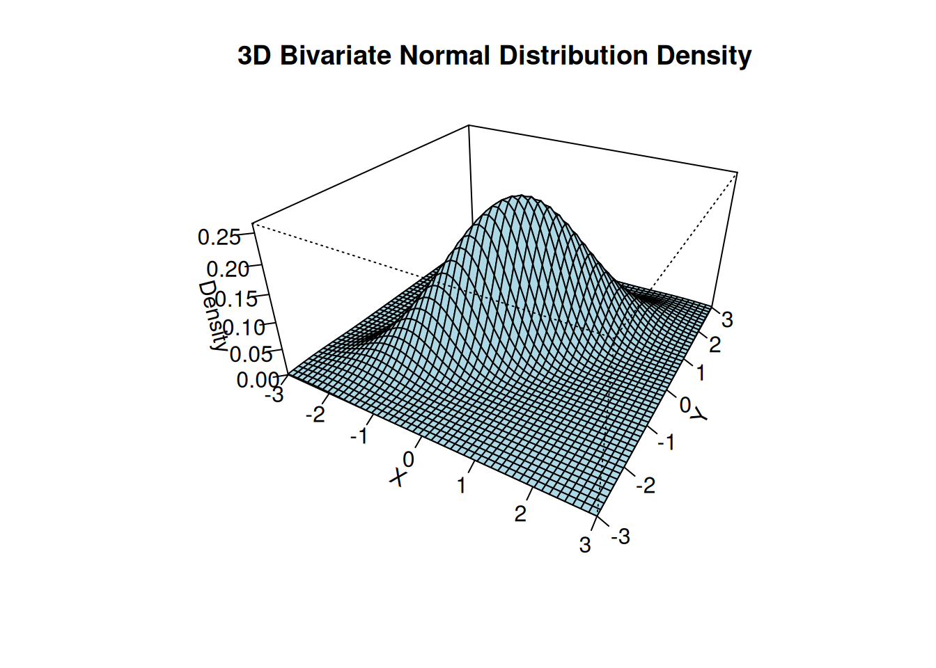 The 3d plot shows the bivariate normal PDF with parameters \boldsymbol \mu = \begin{pmatrix} 0 \\ 0 \end{pmatrix}, \quad \boldsymbol \Sigma = \begin{pmatrix} 1 & 0.8 \\ 0.8 & 1 \end{pmatrix}.
