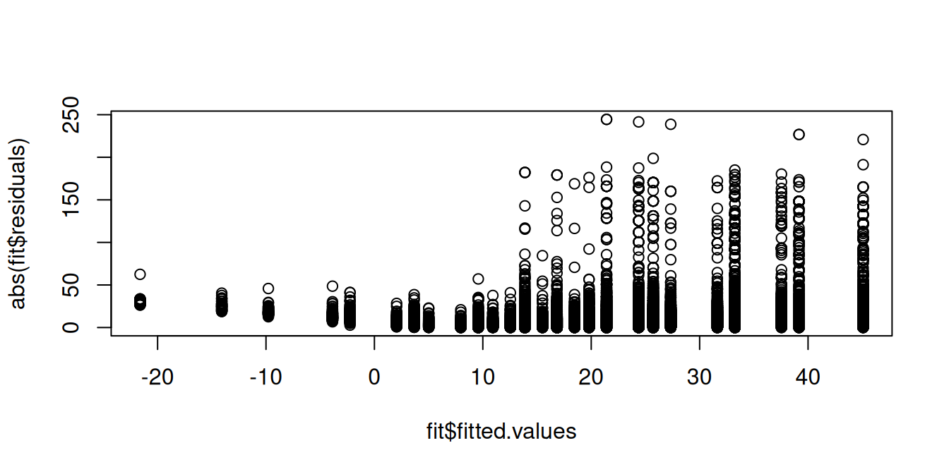 A plot of the absolute value of the residuals against the fitted values shows that individuals with predicted wages around 10 USD exhibit residuals with lower variance compared to those with higher predicted wage levels. Hence, the homoskedasticity assumption (A5) is implausible.