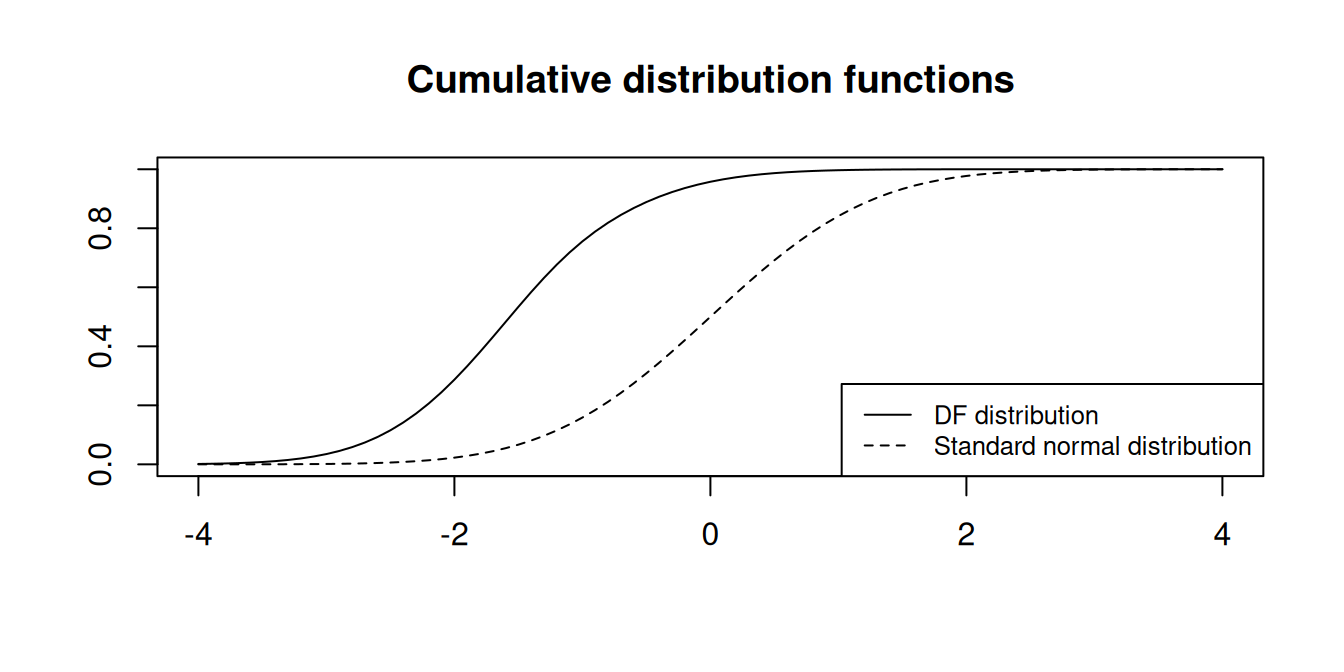 Unfortunately, under H_0 the time series regression assumptions are not sarisfied because Y_t is a random walk. The OLS estimator is not normally distributed, but is is consistent. It can be shown that the t-statistic does not converge to a standard normal distribution. Instead, it converges to the Dicke-Fuller distrubution: Z_{\widehat \phi} \overset{D}{\longrightarrow} DF