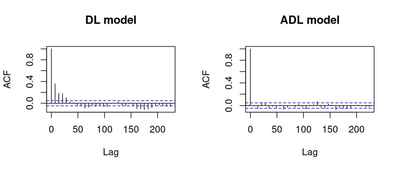 The residuals in the ADL(2,2) model gas_t = \alpha_0 + \alpha_1 gas_{t-1} + \alpha_2 gas_{t-2} + \delta_1 oil_{t-1} + \delta_2 oil_{t-2} + u_t indicate no autocorrelation in the error term. We can use HC standard errors: