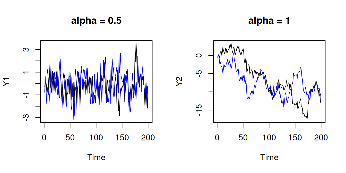 Let’s simulate two independent AR(1) processes: Y_t = \alpha Y_{t-1} + u_t, \quad X_t = \alpha X_{t-1} + v_t, for t=1, \ldots, 200, where u_t and v_t are i.i.d. standard normal. If \alpha = 0.5, the processes are stationary. If \alpha = 1, the processes are nonstationary (random walk).