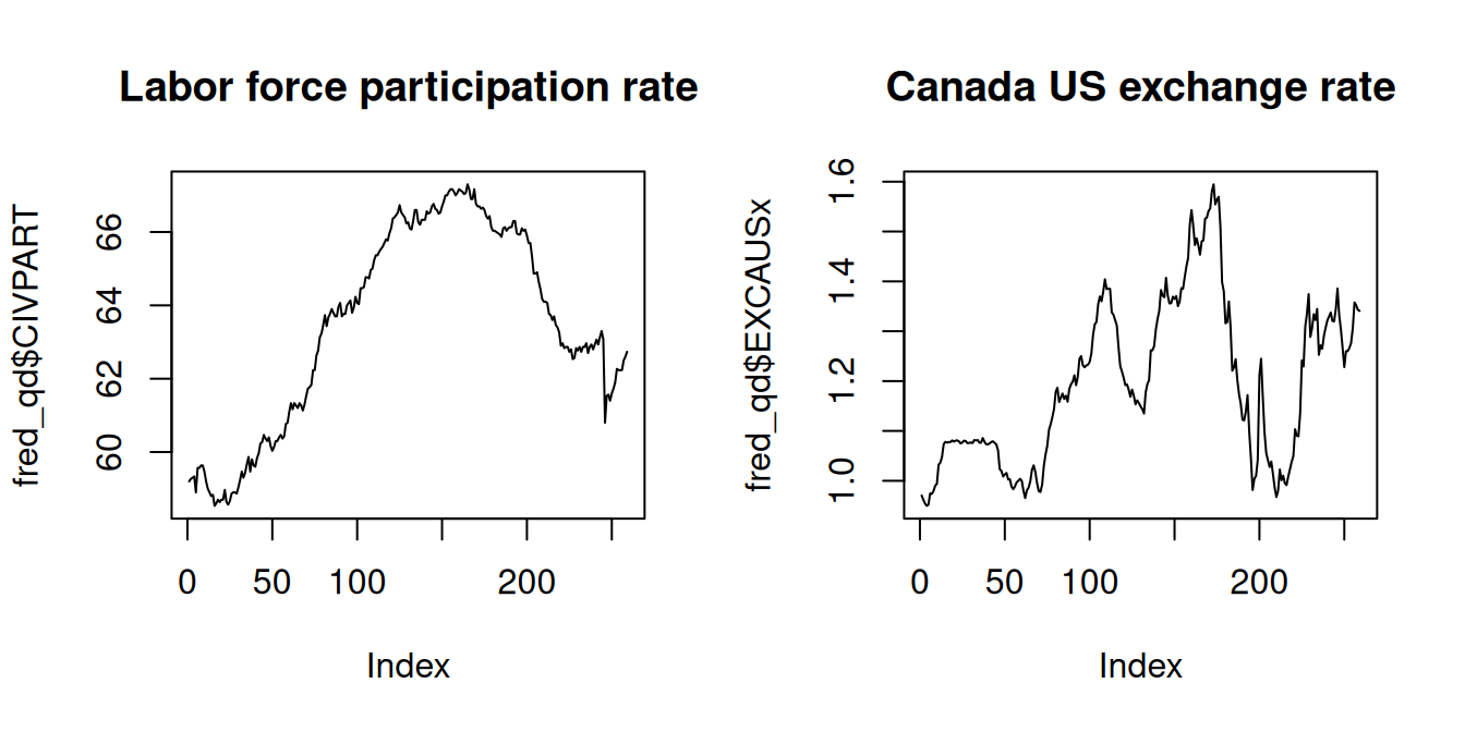 The FRED-QD database offers a comprehensive collection of quarterly U.S. macroeconomic time series data. A subset of this data is contained in the package BVAR. See the appendix of this paper for a detailed description of the data.